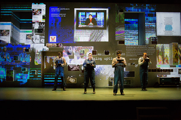 Photos of Steppenwolf for Young Adults' production of George Orwell's 1984. The play was adapted by Andrew White and directed by Hallie Gordon. Casting includes Matthew Abraham, Atra Asdou, Lance Baker, Elizabeth Birnkrant, Manny Buckley, Dennis Grimes, Tyrone Phillips and Adam Poss.Tyrone Phillips, Elizabeth Birnkrant, Adam Poss and Dennis Grimes