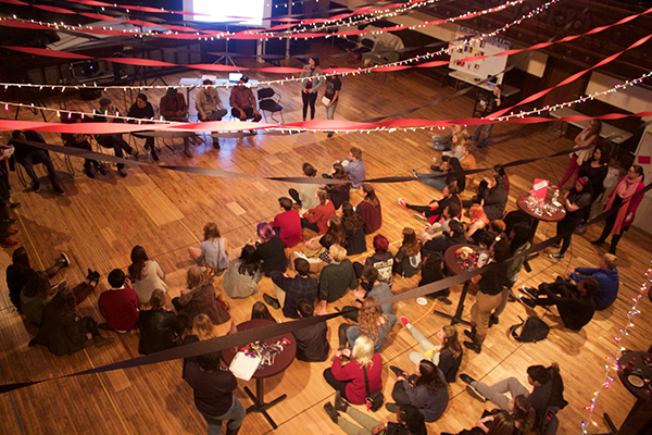 On Saturday, November 7, teens from across Chicago gathered at Steppenwolf Theatre Company for the Young Adult Council hosted event The Scene: George Orwell's 1984. They gathered together for a night of activities, artistic discussion and dancing inspired by the Steppenwolf for Young Adults’ production. The theme of the event was, “What’s your rebellion?”Guests enjoy a discussion with the cast of <i>1984</i>