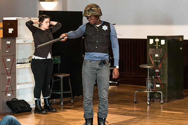 Rehearsal photos of Steppenwolf for Young Adults' production of George Orwell's 1984. The play was adapted by Andrew White and directed by Hallie Gordon. Casting includes Matthew Abraham, Atra Asdou, Lance Baker, Elizabeth Birnkrant, Manny Buckley, Dennis Grimes, Tyrone Phillips and Adam Poss.Atra Asdou