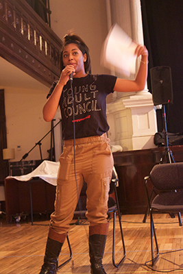 On Saturday, November 7, teens from across Chicago gathered at Steppenwolf Theatre Company for the Young Adult Council hosted event The Scene: George Orwell's 1984. They gathered together for a night of activities, artistic discussion and dancing inspired by the Steppenwolf for Young Adults’ production. The theme of the event was, “What’s your rebellion?”YAC member Charlotte Jackson performs a spoken-word poem as part of the event