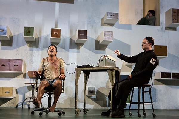 Photos of Steppenwolf for Young Adults' production of George Orwell's 1984. The play was adapted by Andrew White and directed by Hallie Gordon. Casting includes Matthew Abraham, Atra Asdou, Lance Baker, Elizabeth Birnkrant, Manny Buckley, Dennis Grimes, Tyrone Phillips and Adam Poss.Lance Baker and Adam Poss