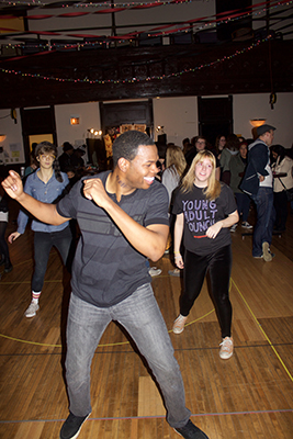 Photos of Steppenwolf for Young Adults' production of George Orwell's 1984. The play was adapted by Andrew White and directed by Hallie Gordon. Casting includes Matthew Abraham, Atra Asdou, Lance Baker, Elizabeth Birnkrant, Manny Buckley, Dennis Grimes, Tyrone Phillips and Adam Poss.<i>1984</i> cast member Tyrone Phillips dances with guests